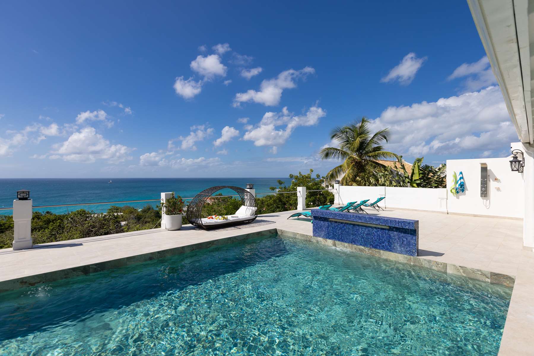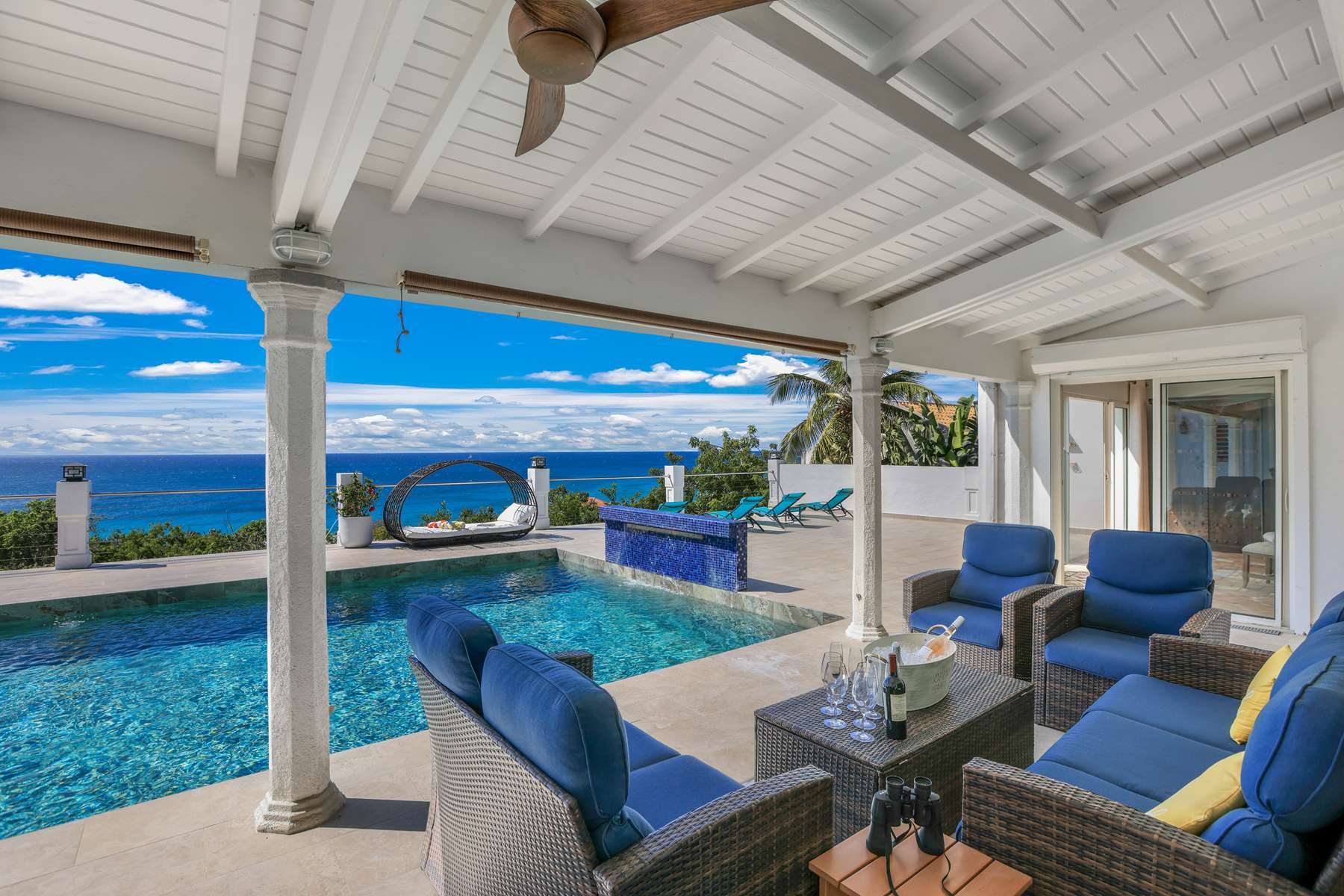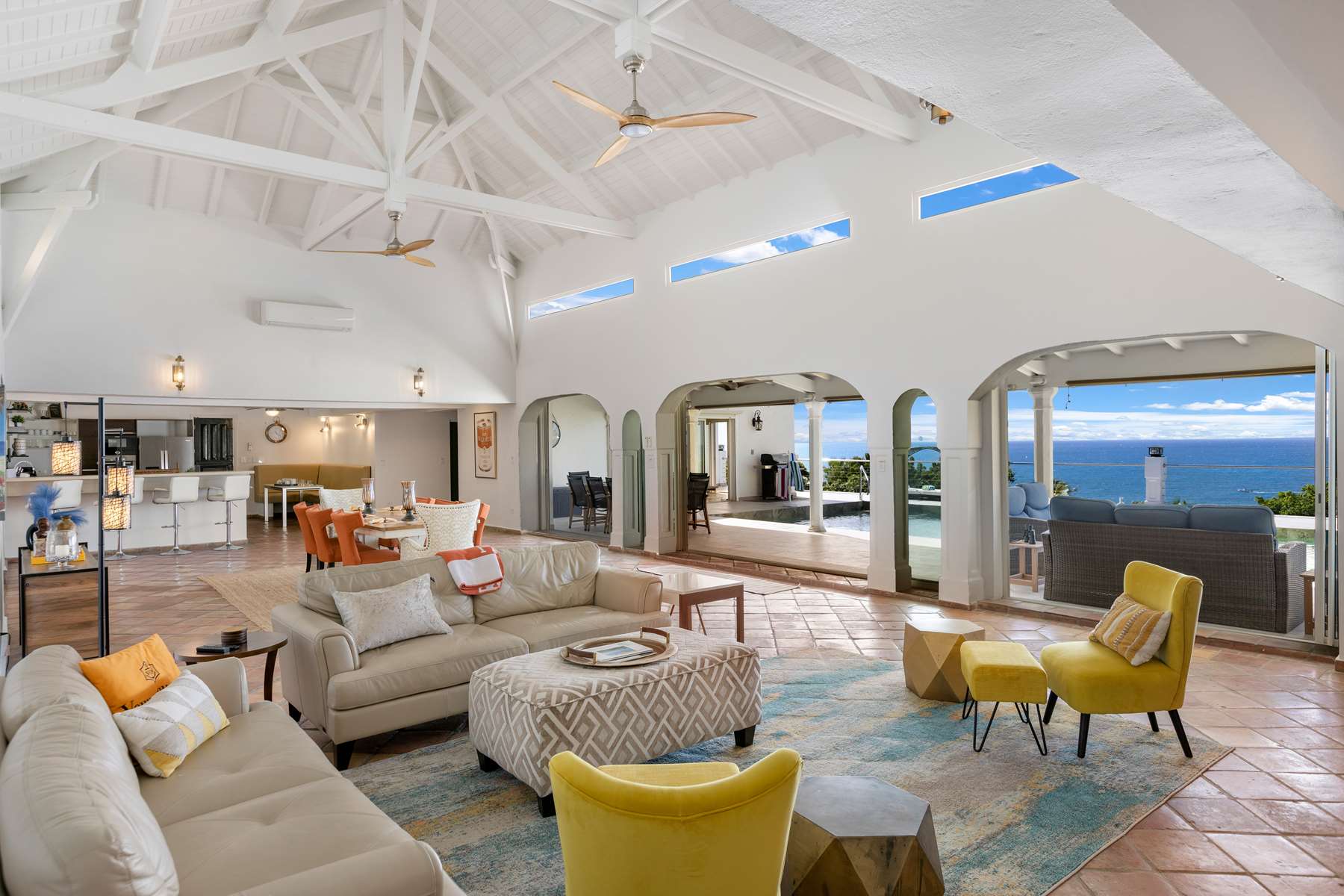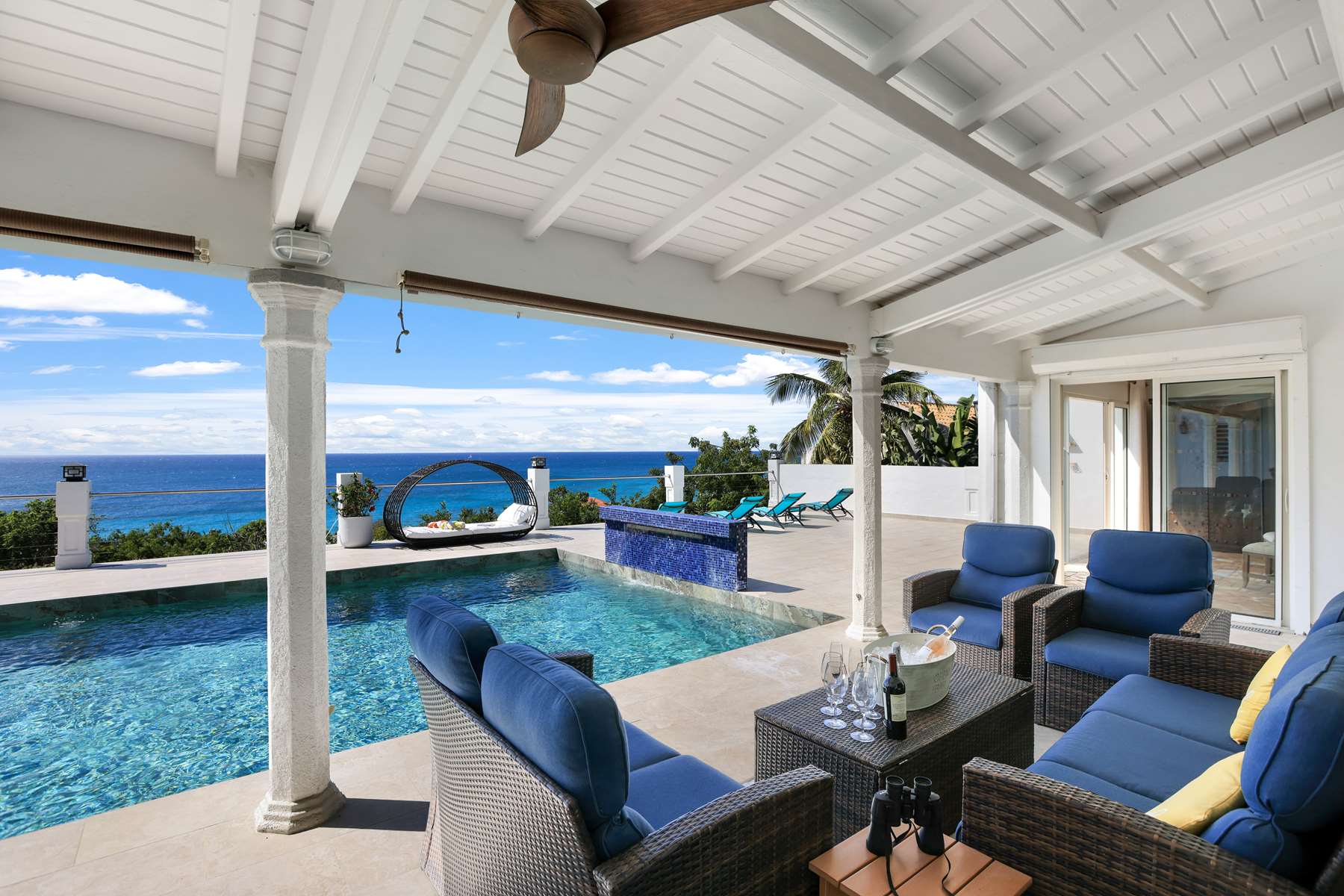 This property has an open concept kitchen with a breakfast nook and bar. The kitchen and living room connect to the pool deck that boasts a large salt water pool, outdoor shower, dining & lounging areas with an expansive views of the Caribbean Sea and brilliant sunsets. There is also a separate laundry room.
