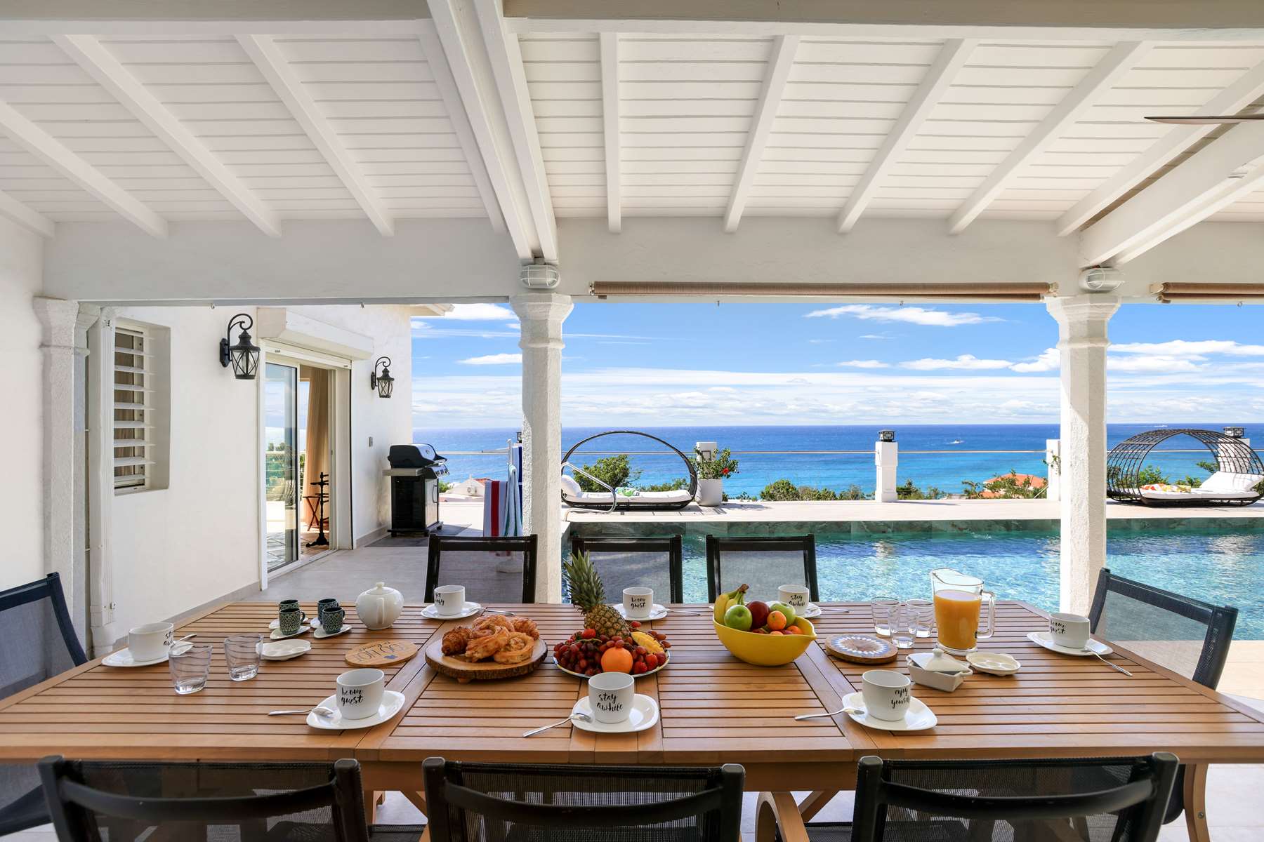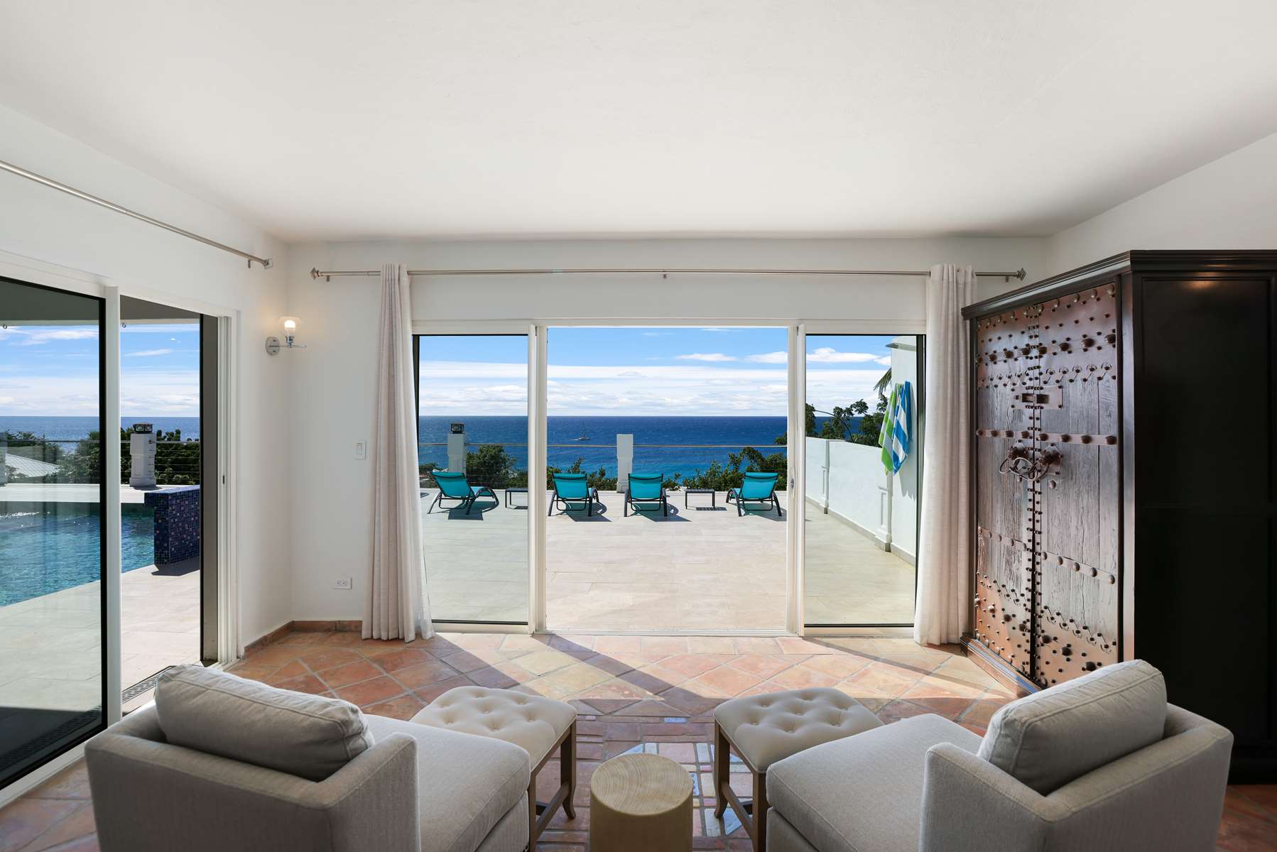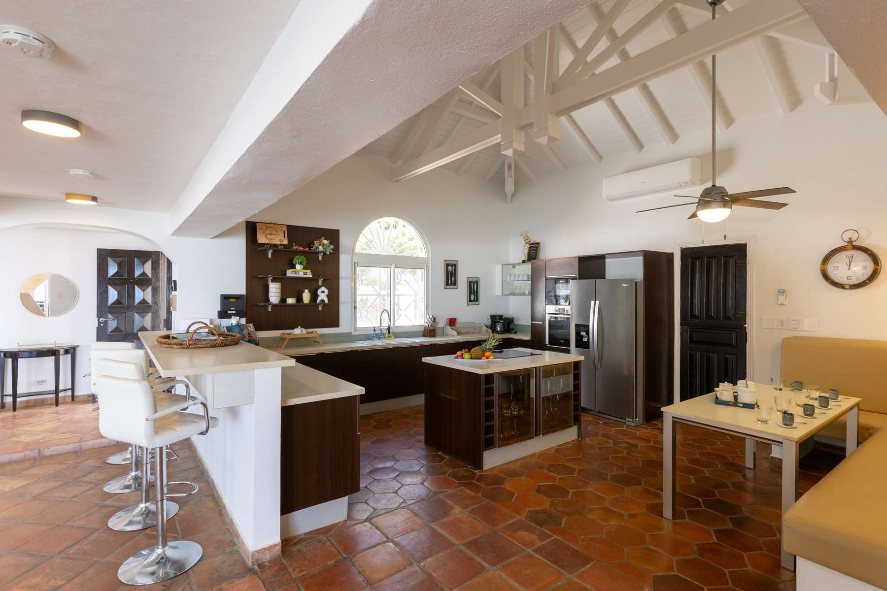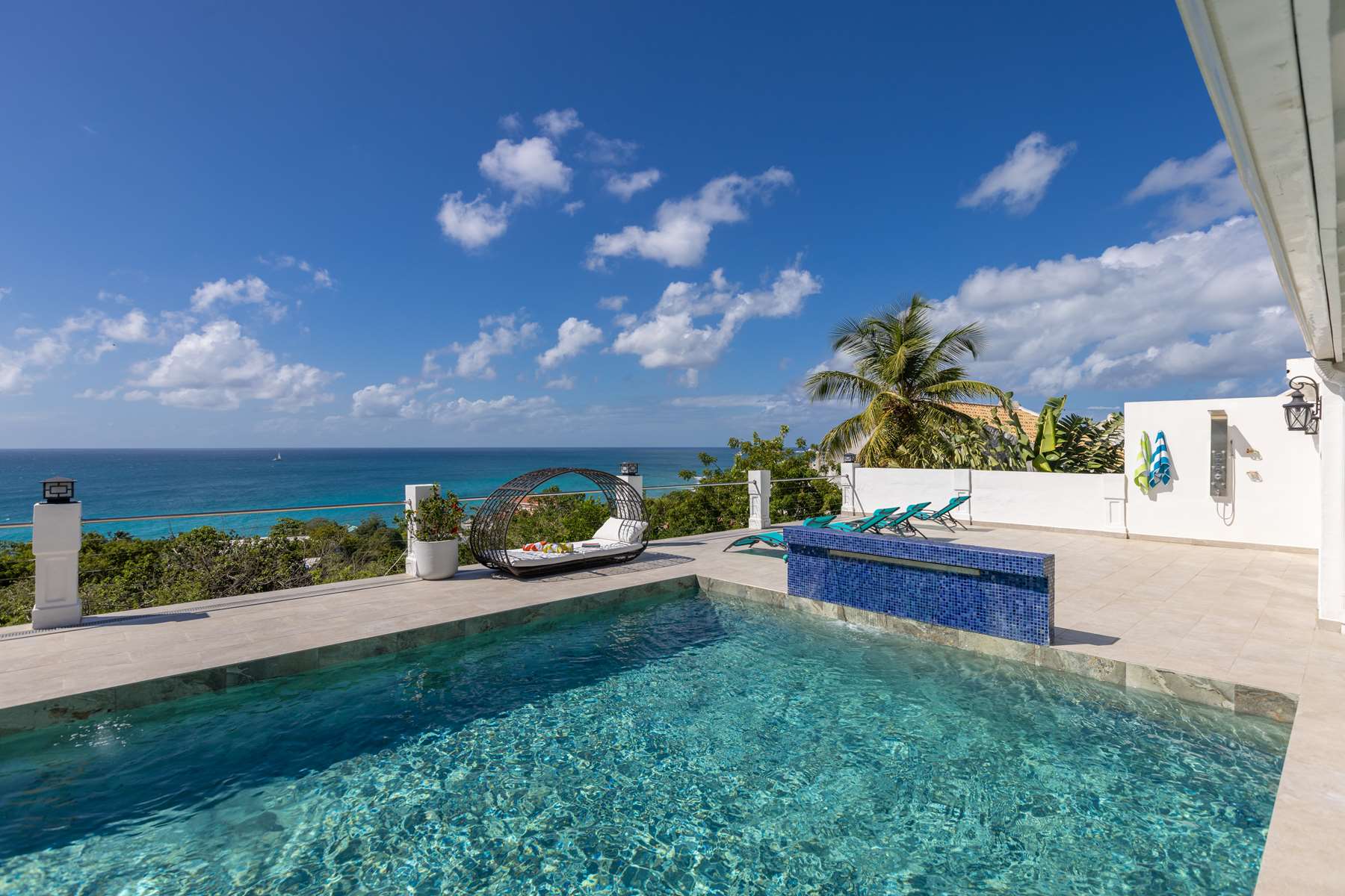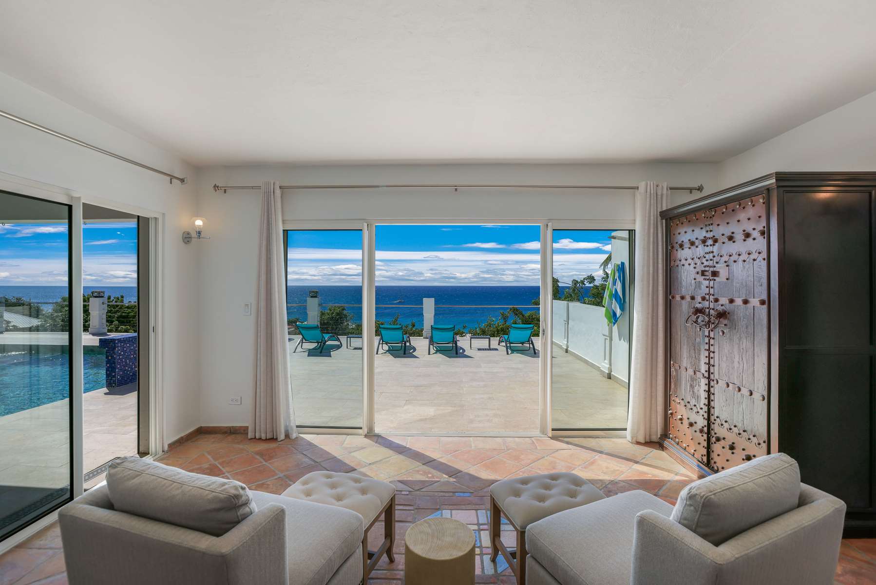 This property has an open concept kitchen with a breakfast nook and bar. The kitchen and living room connect to the pool deck that boasts a large salt water pool, outdoor shower, dining & lounging areas with an expansive views of the Caribbean Sea and brilliant sunsets. There is also a separate laundry room.