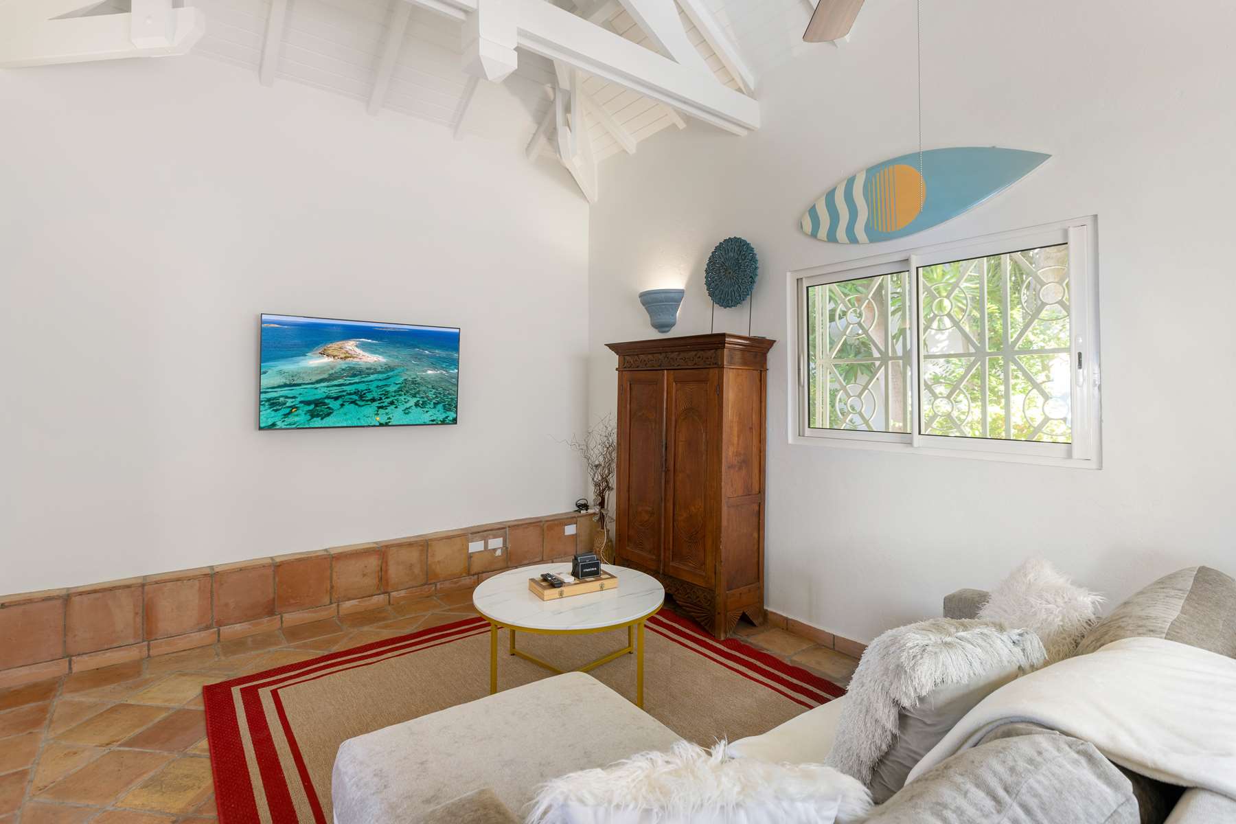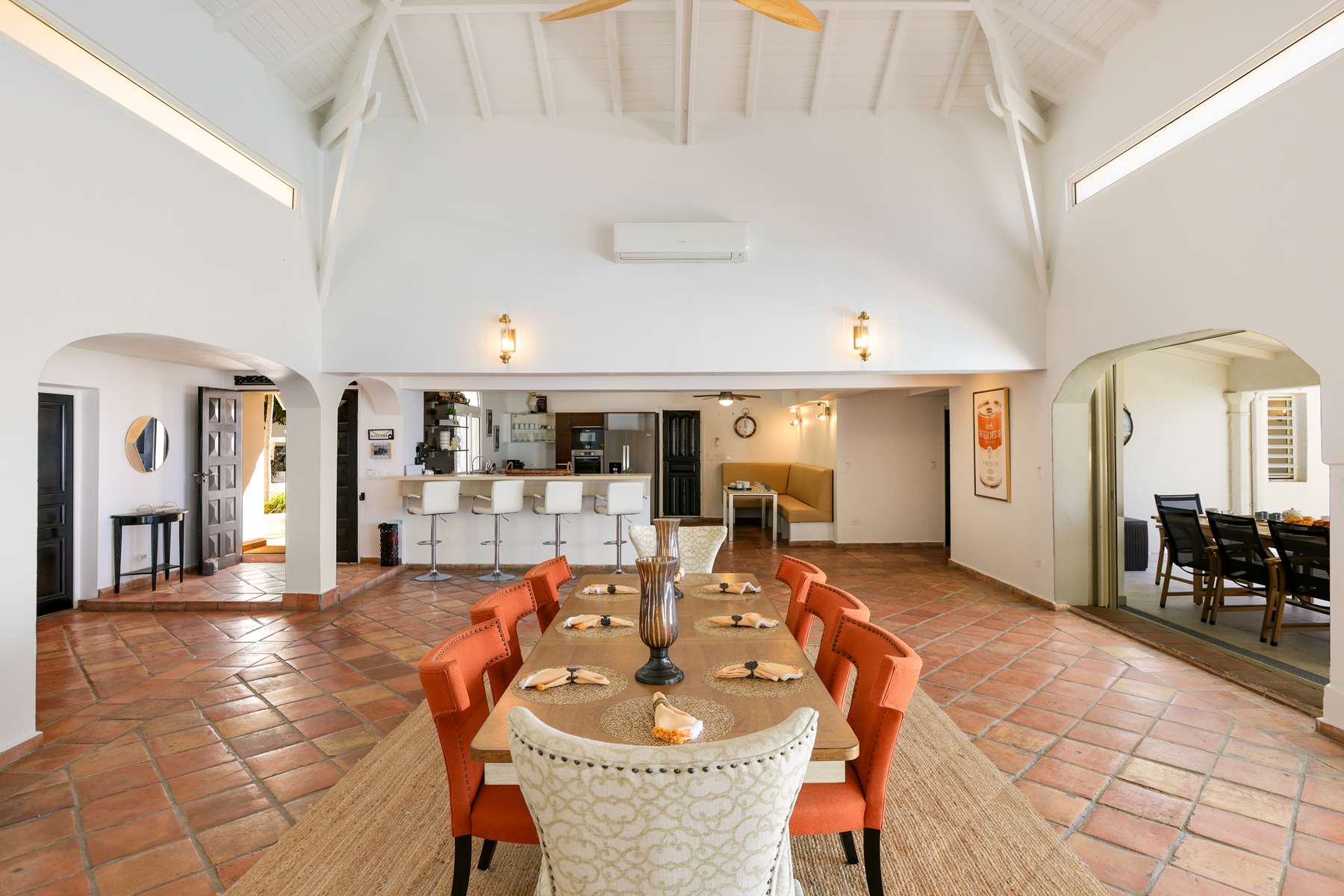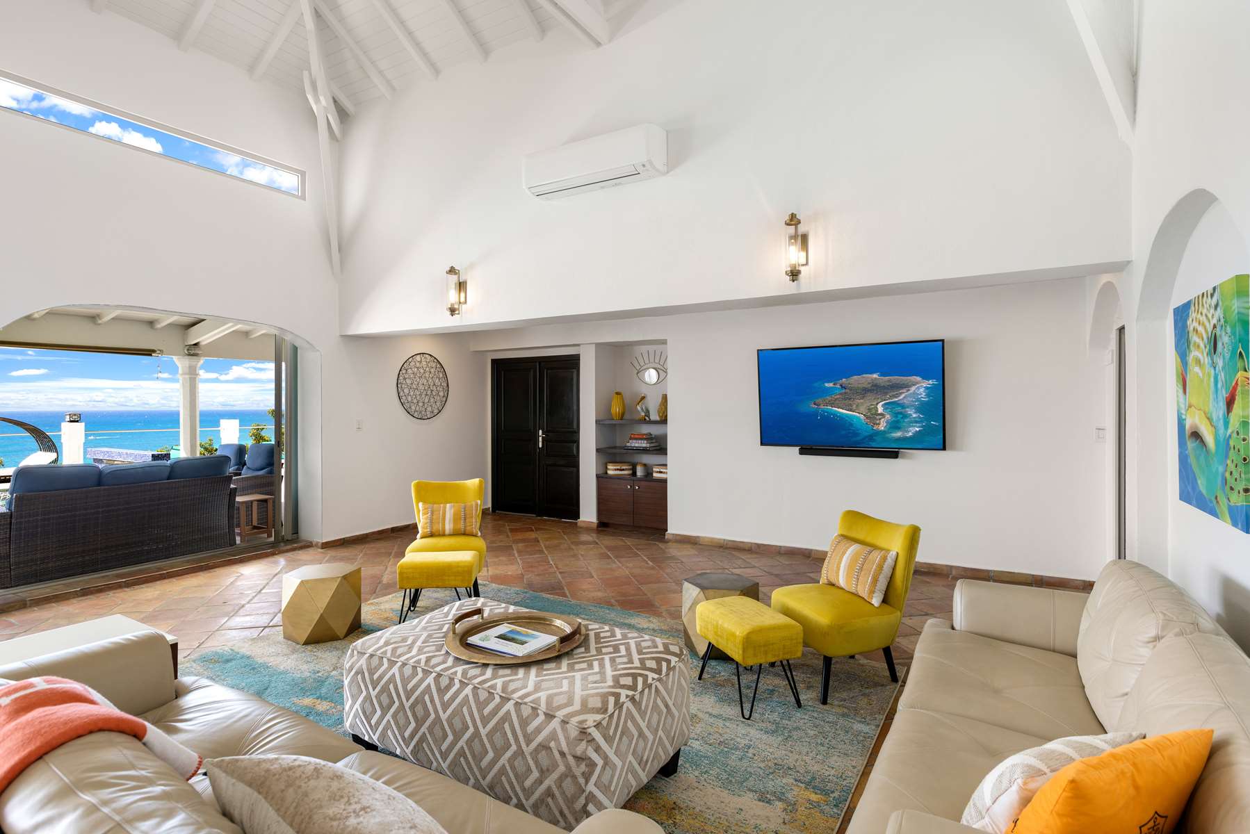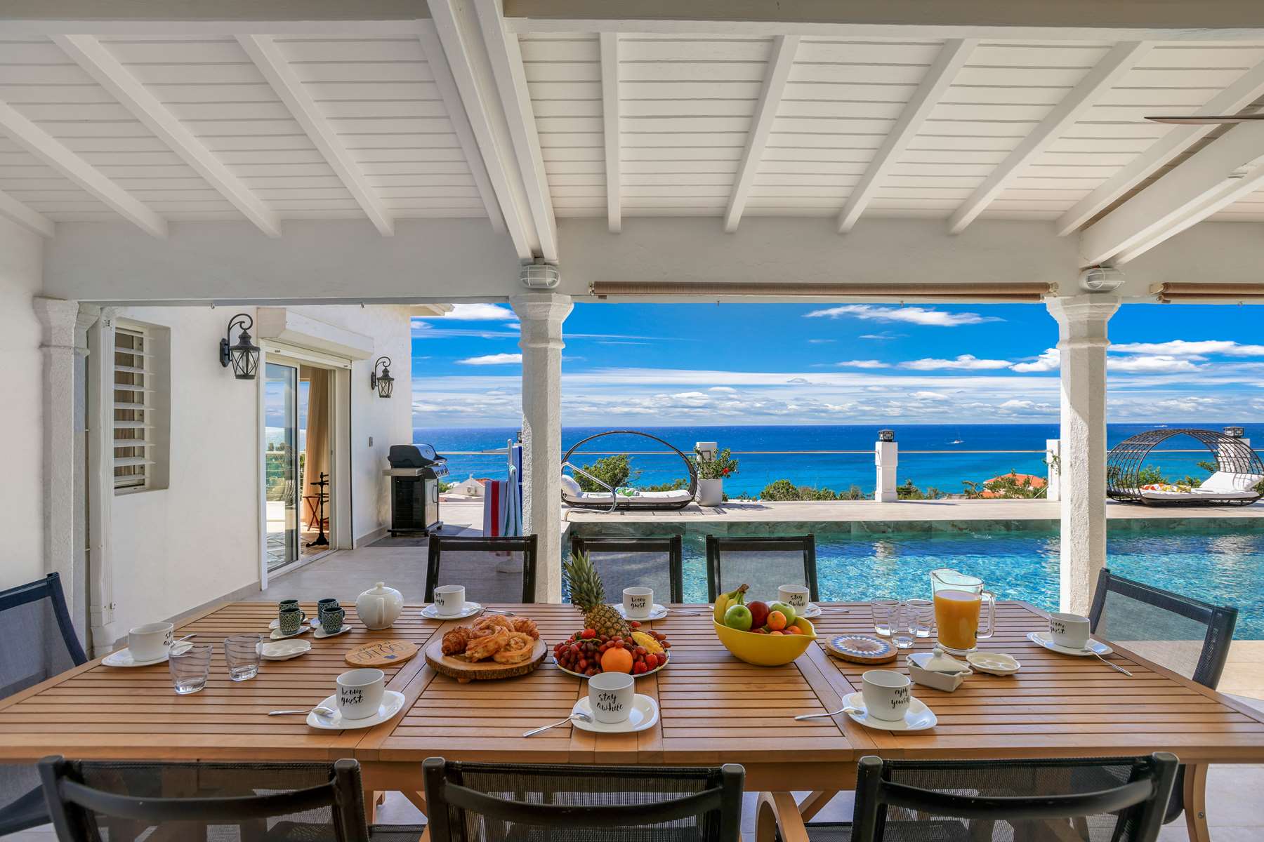 This property has an open concept kitchen with a breakfast nook and bar. The kitchen and living room connect to the pool deck that boasts a large salt water pool, outdoor shower, dining & lounging areas with an expansive views of the Caribbean Sea and brilliant sunsets. There is also a separate laundry room.