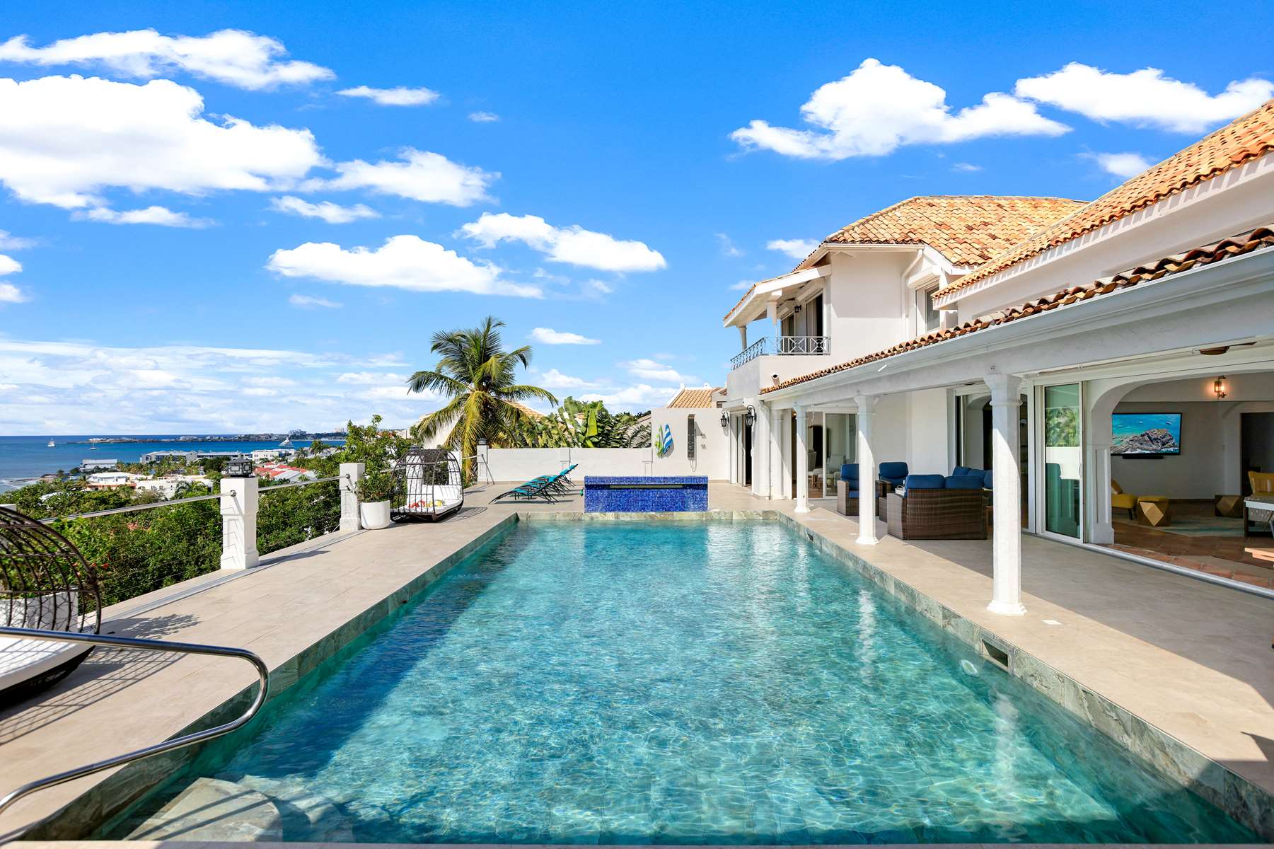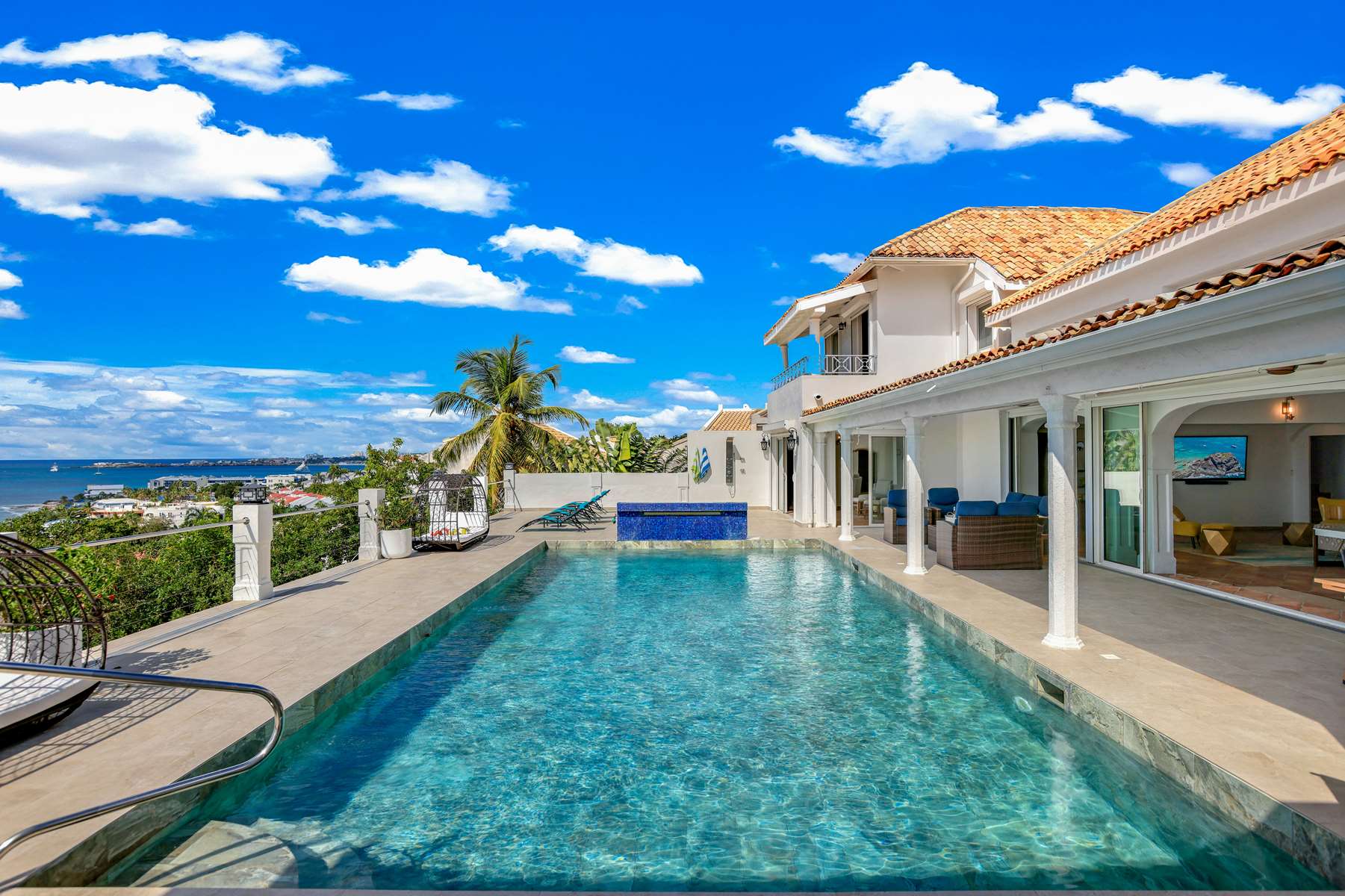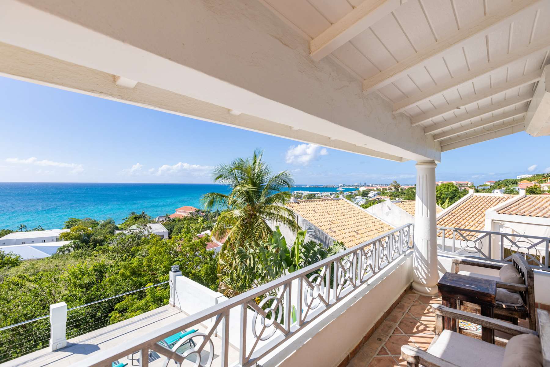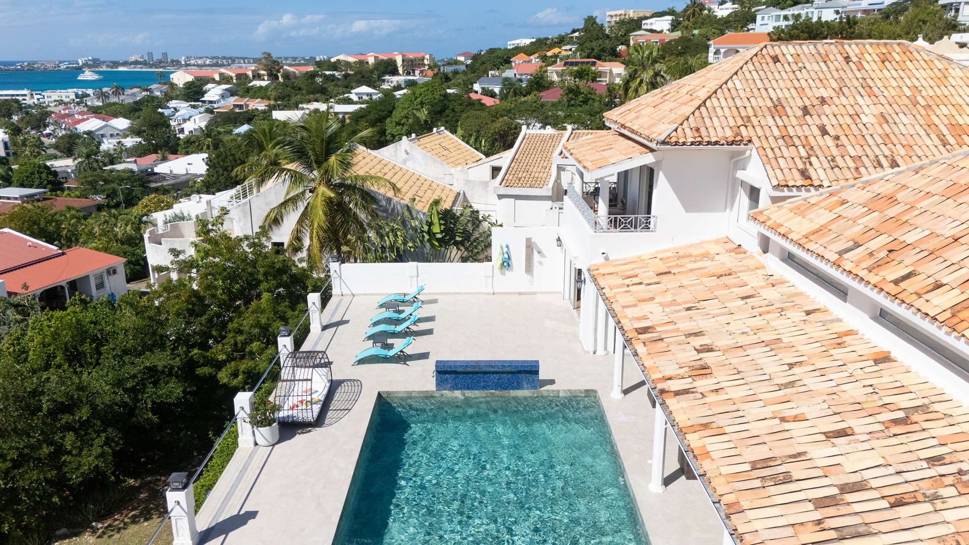 This magnificent Spanish-style family villa boasts 5 bedrooms each with their own ensuite bathrooms, a guest bathroom, and spectacular unobstructed ocean views on a southwest facing property in the most popular neighborhood in St Maarten, Pelican Key. The villa sits on a large double lot with a landscaped garden lot that the pool deck overlooks.
