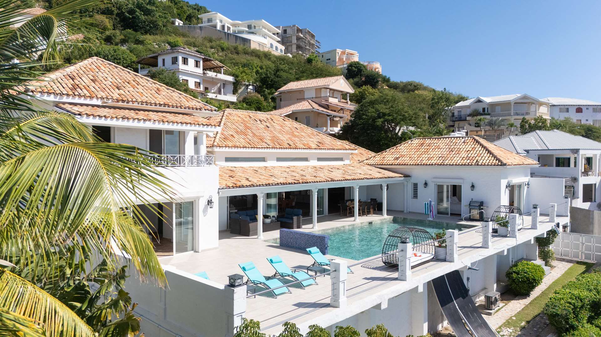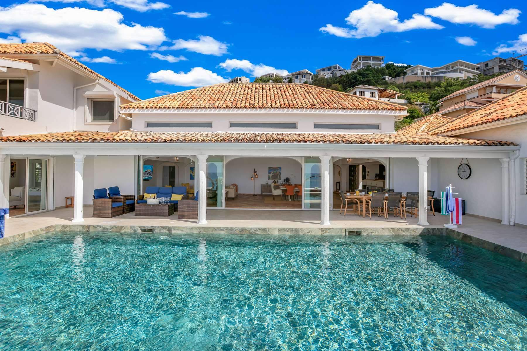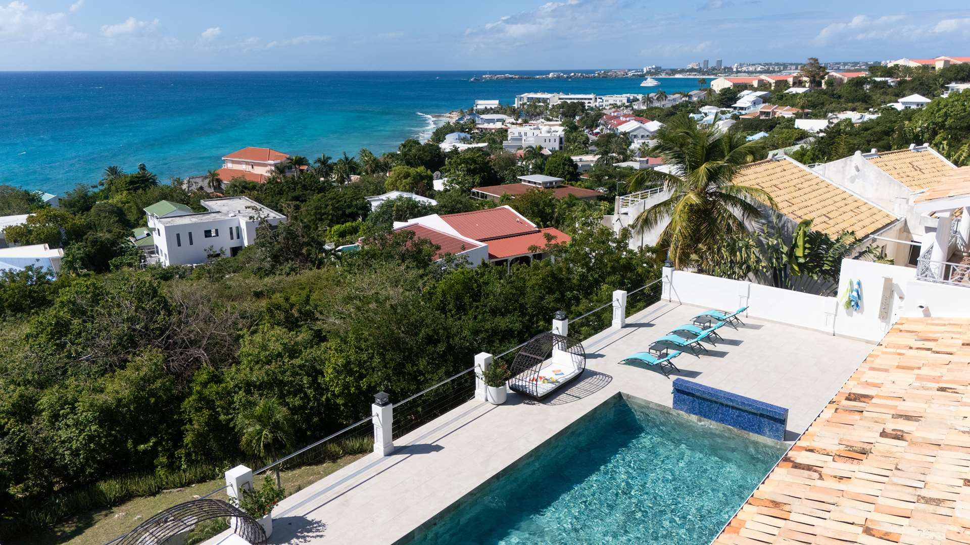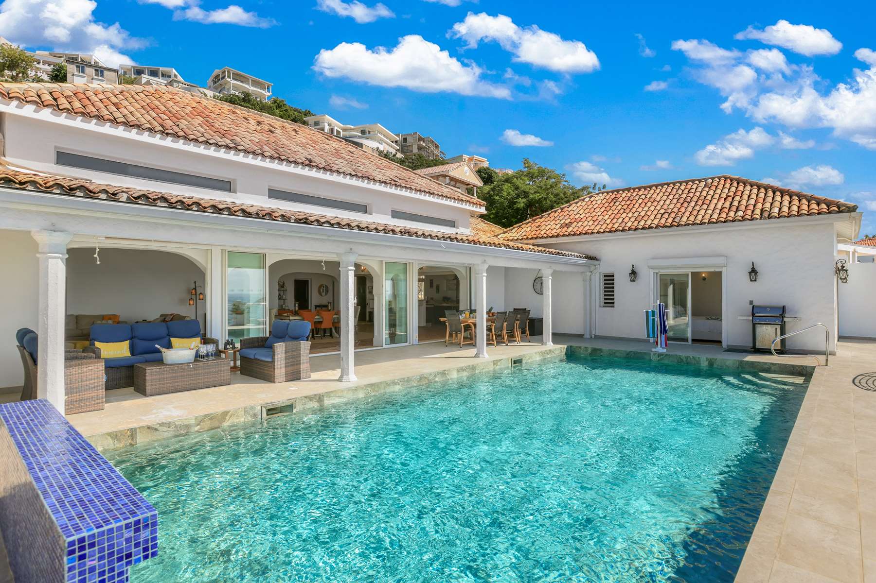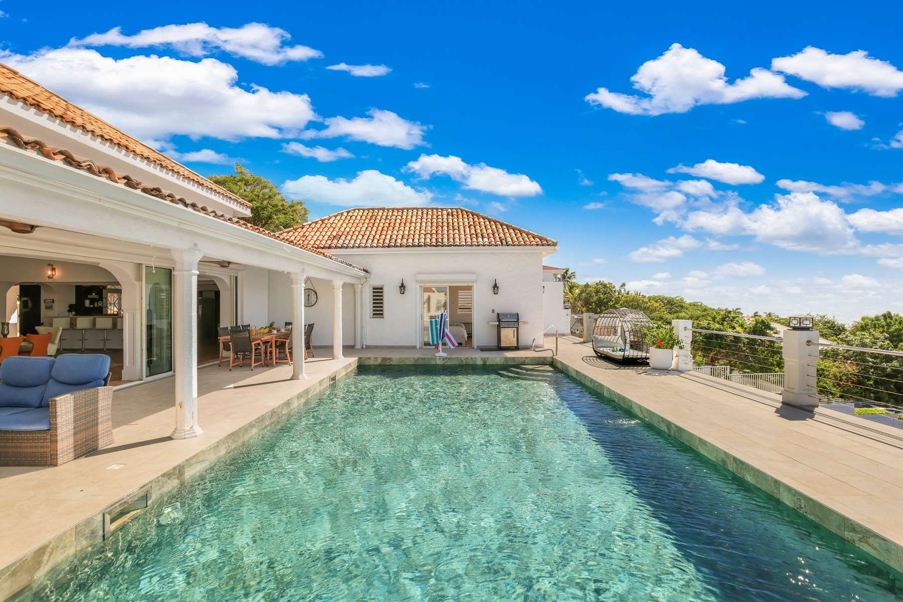 This magnificent Spanish-style family villa boasts 5 bedrooms each with their own ensuite bathrooms, a guest bathroom, and spectacular unobstructed ocean views on a southwest facing property in the most popular neighborhood in St Maarten, Pelican Key. The villa sits on a large double lot with a landscaped garden lot that the pool deck overlooks.