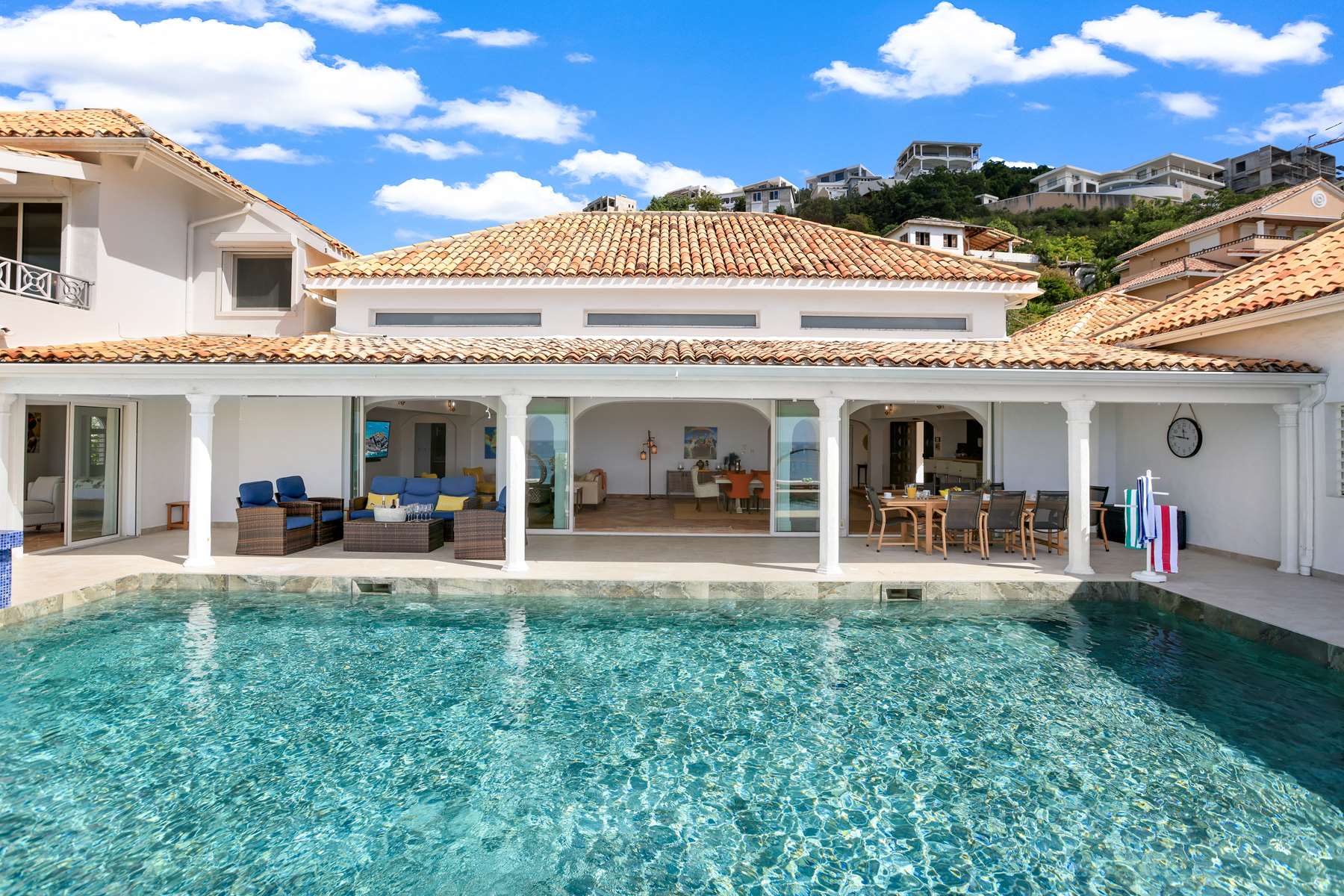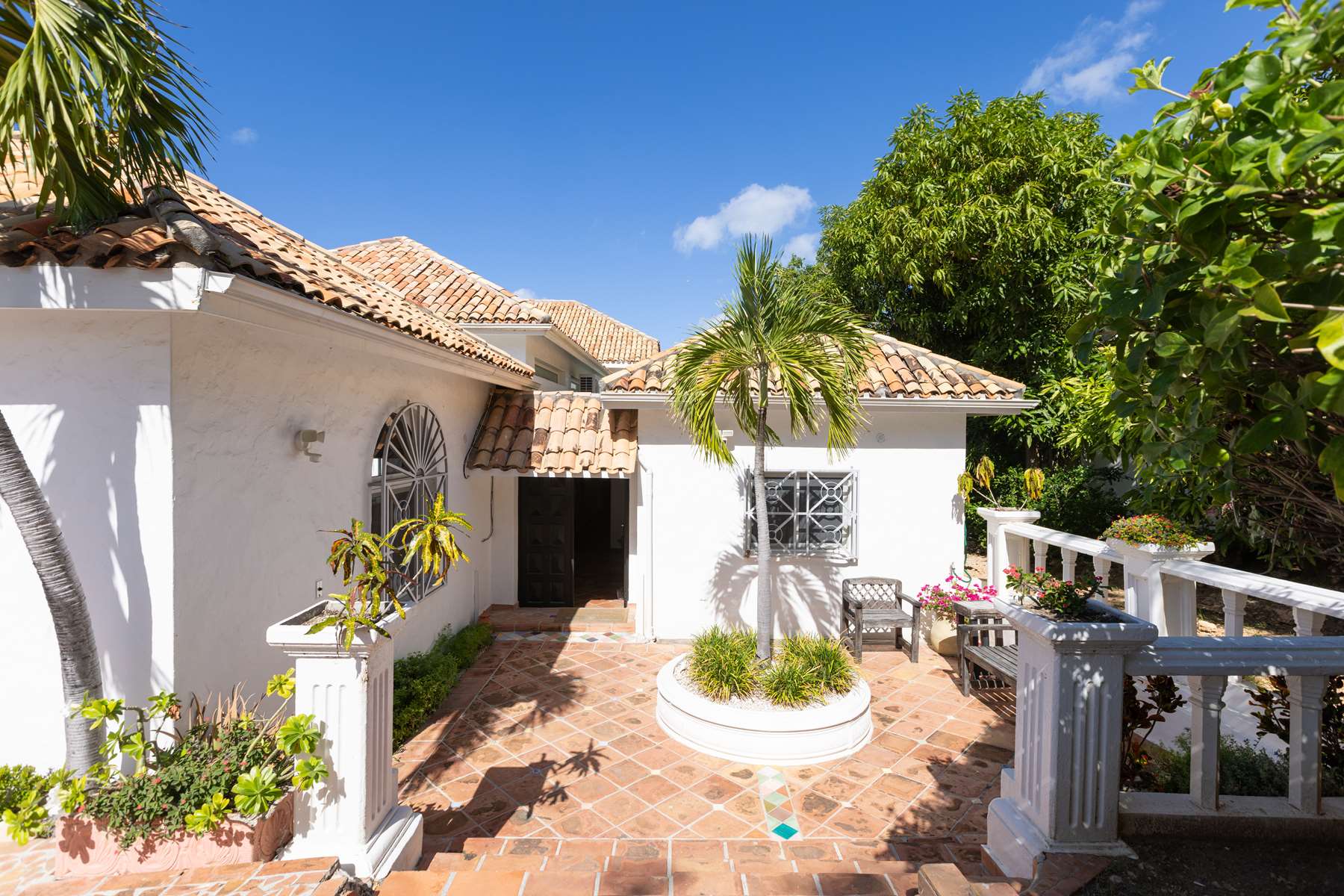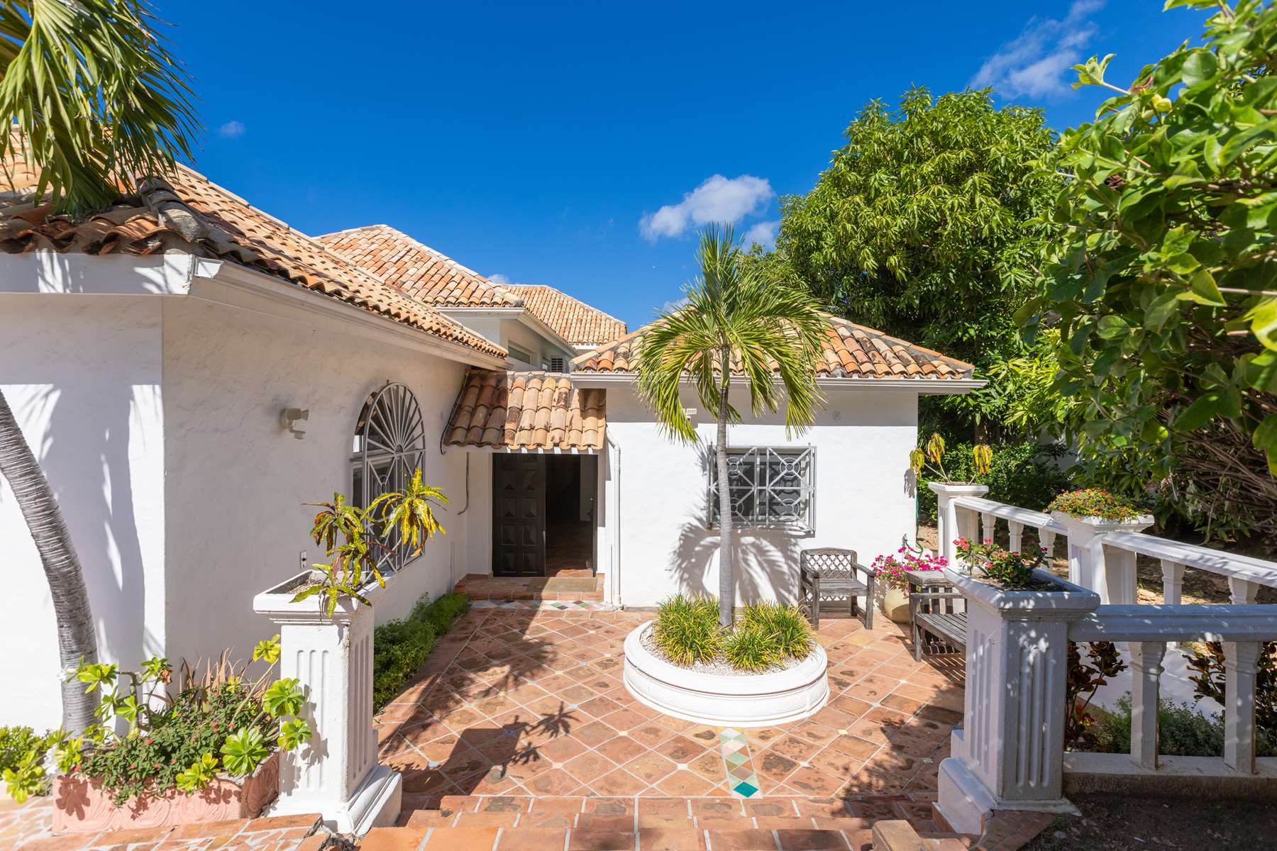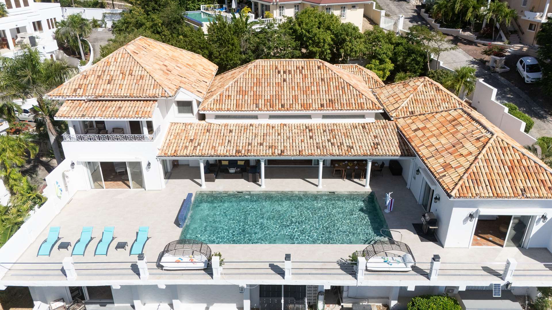 This magnificent Spanish-style family villa boasts 5 bedrooms each with their own ensuite bathrooms, a guest bathroom, and spectacular unobstructed ocean views on a southwest facing property in the most popular neighborhood in St Maarten, Pelican Key. The villa sits on a large double lot with a landscaped garden lot that the pool deck overlooks.