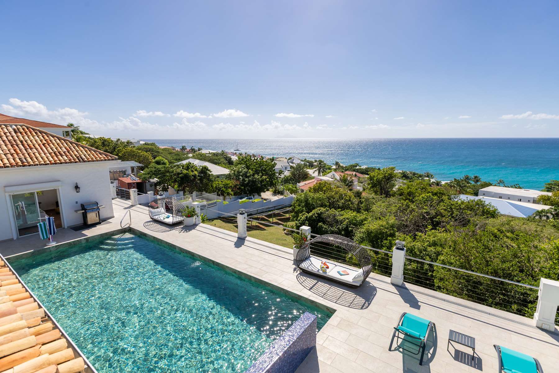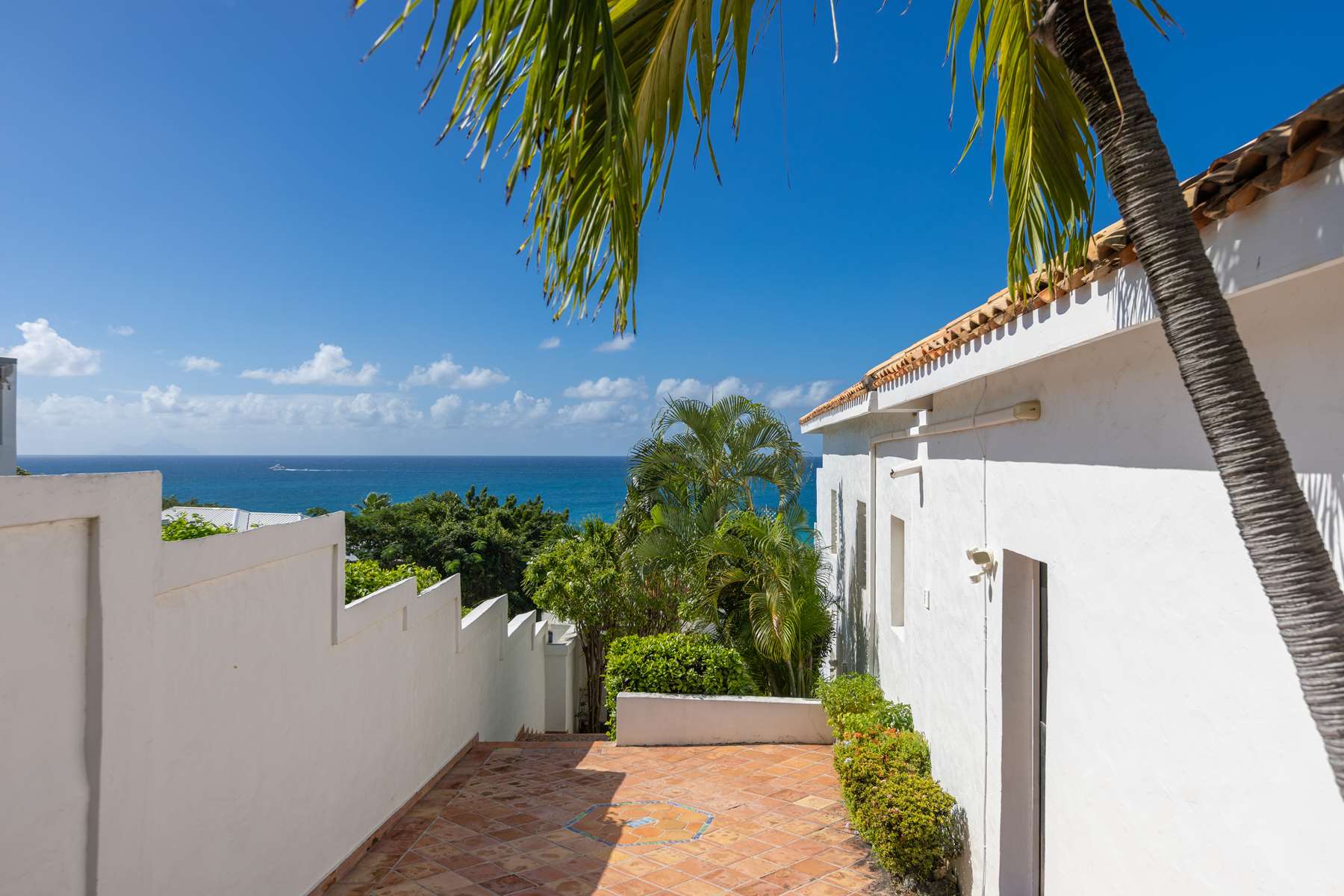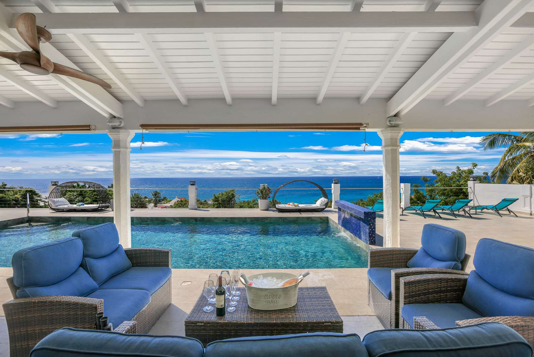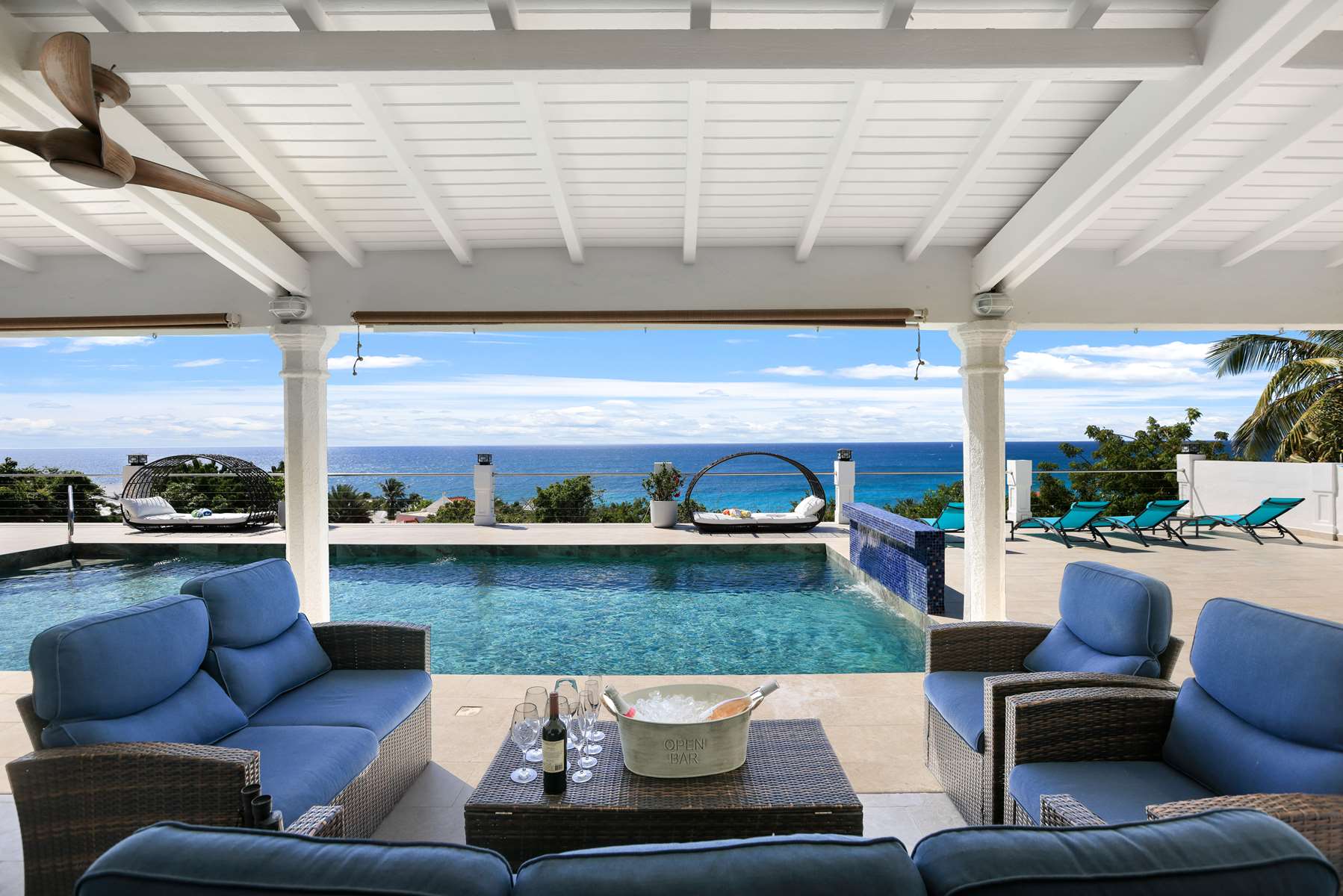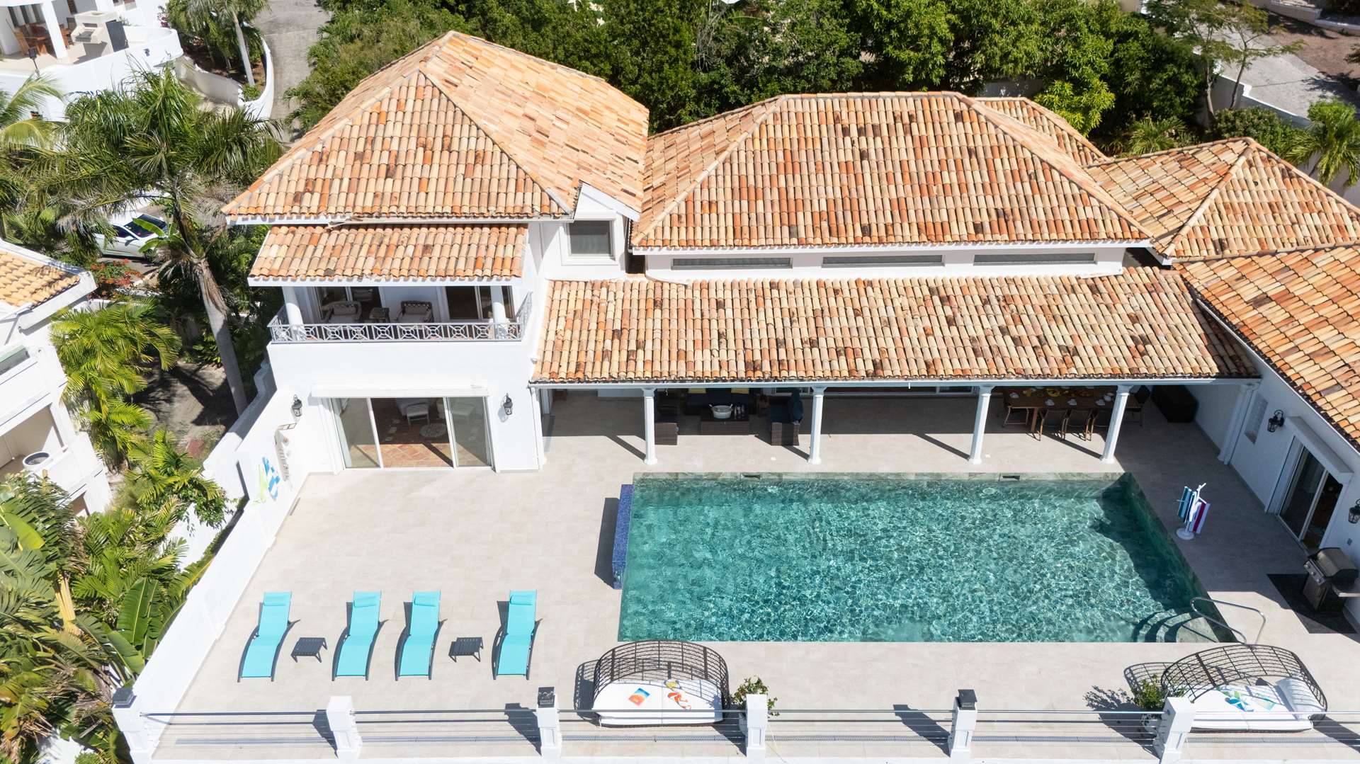 This magnificent Spanish-style family villa boasts 5 bedrooms each with their own ensuite bathrooms, a guest bathroom, and spectacular unobstructed ocean views on a southwest facing property in the most popular neighborhood in St Maarten, Pelican Key. The villa sits on a large double lot with a landscaped garden lot that the pool deck overlooks.