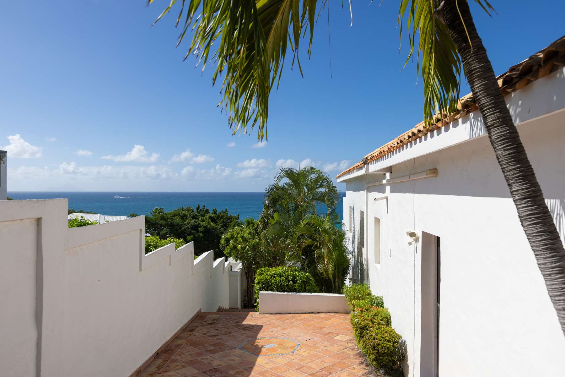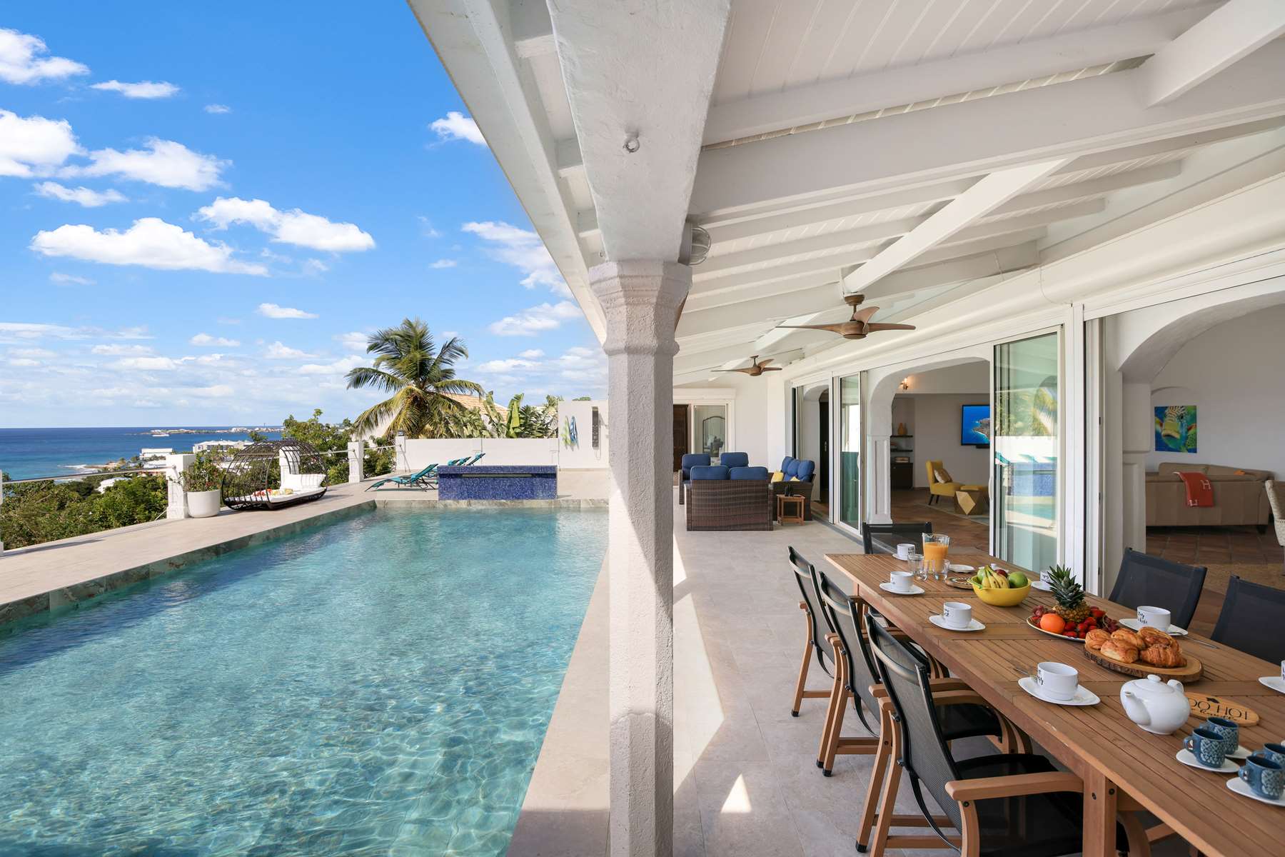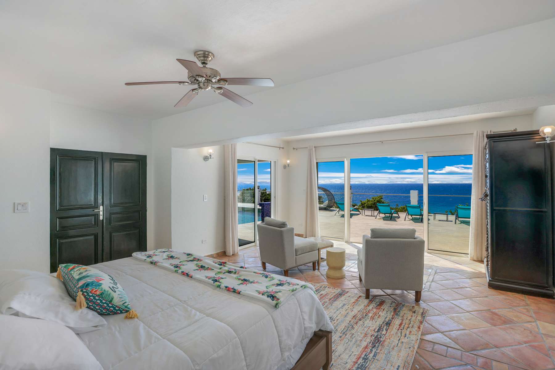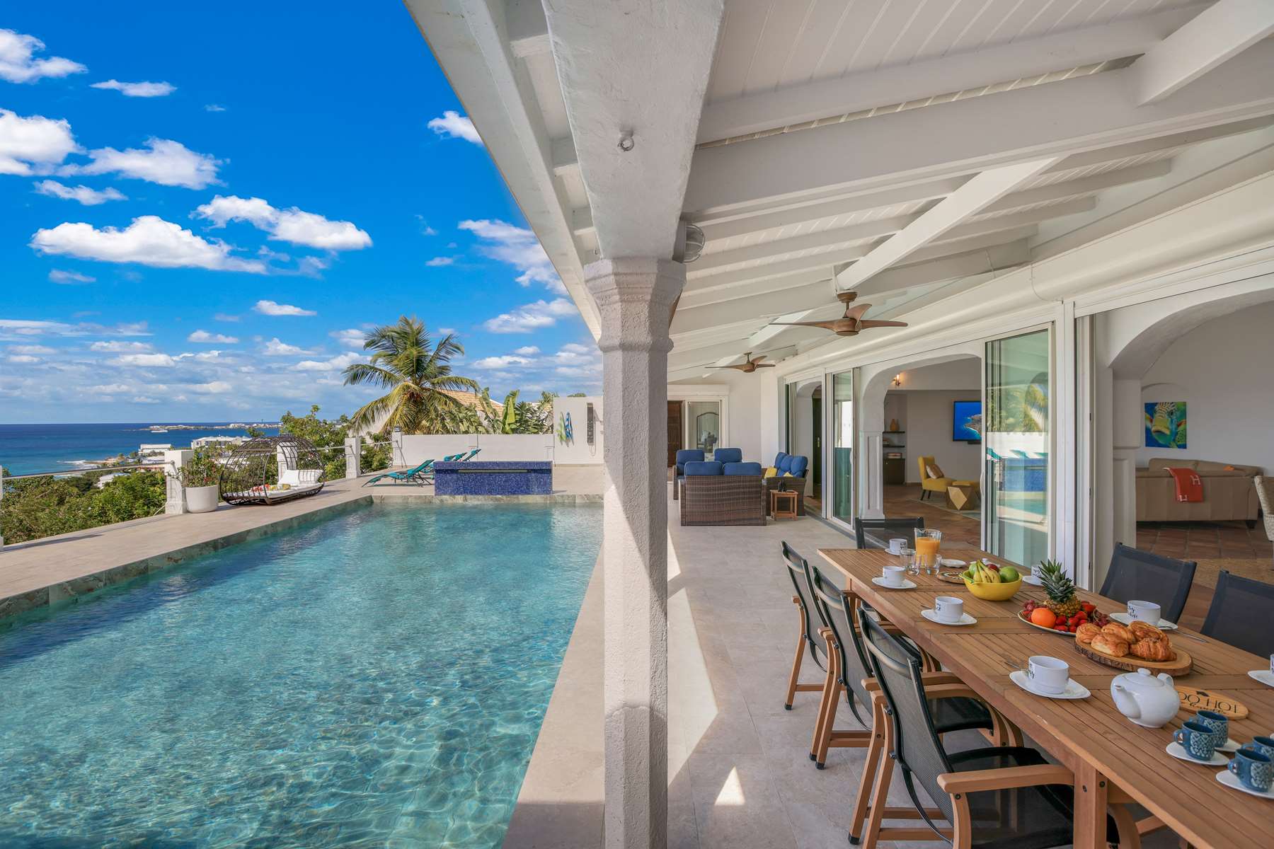 This magnificent Spanish-style family villa boasts 5 bedrooms each with their own ensuite bathrooms, a guest bathroom, and spectacular unobstructed ocean views on a southwest facing property in the most popular neighborhood in St Maarten, Pelican Key. The villa sits on a large double lot with a landscaped garden lot that the pool deck overlooks.