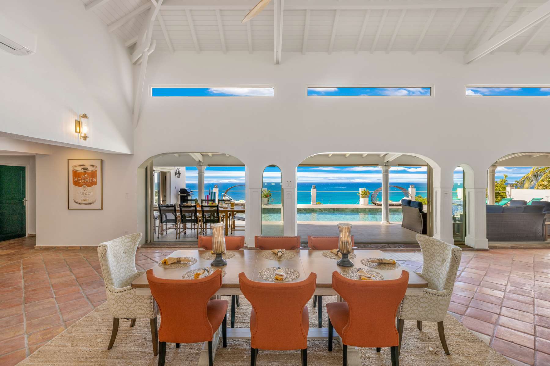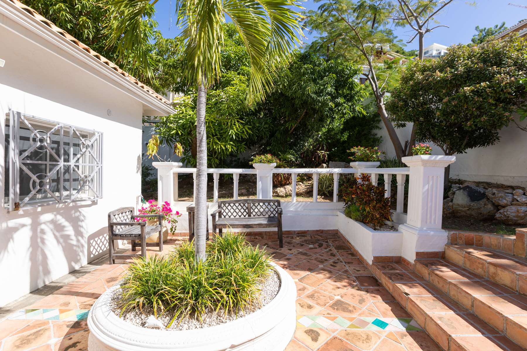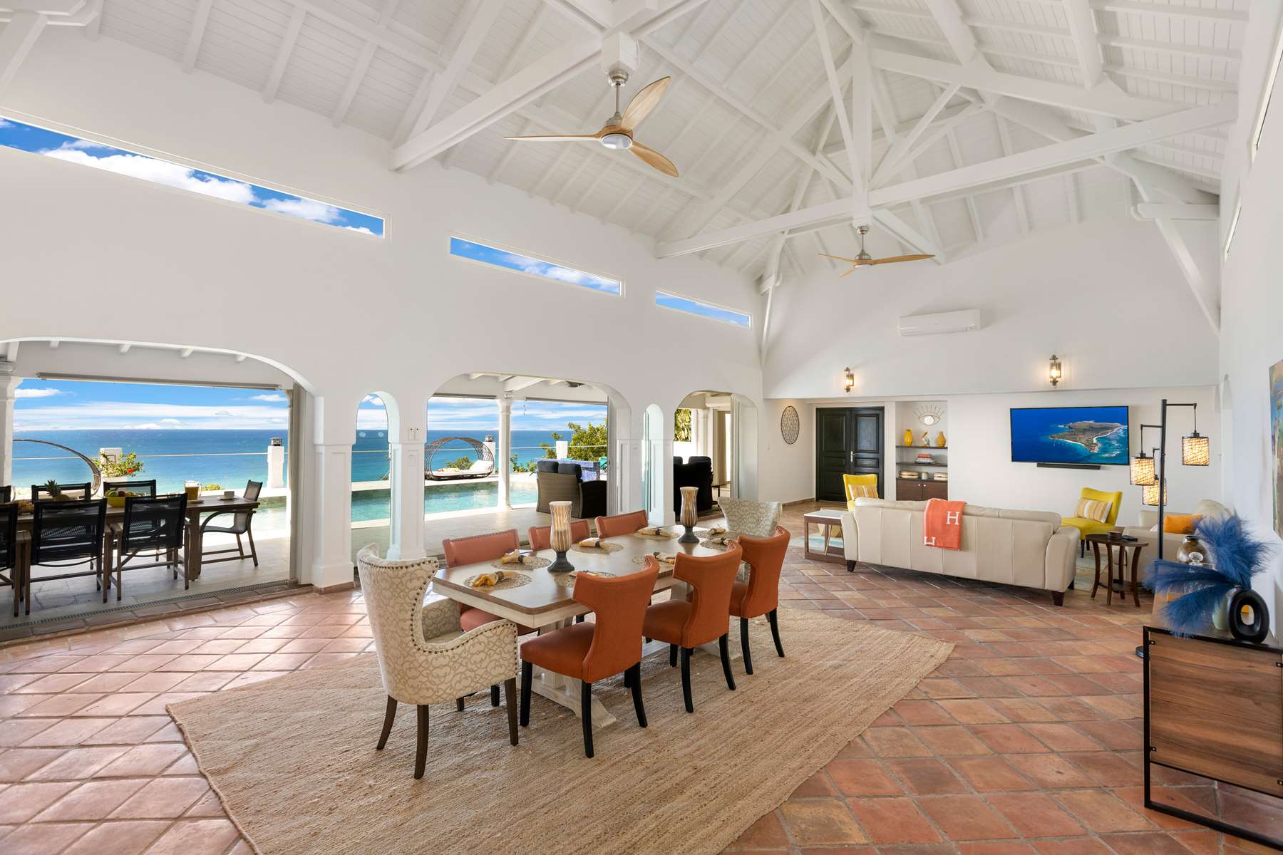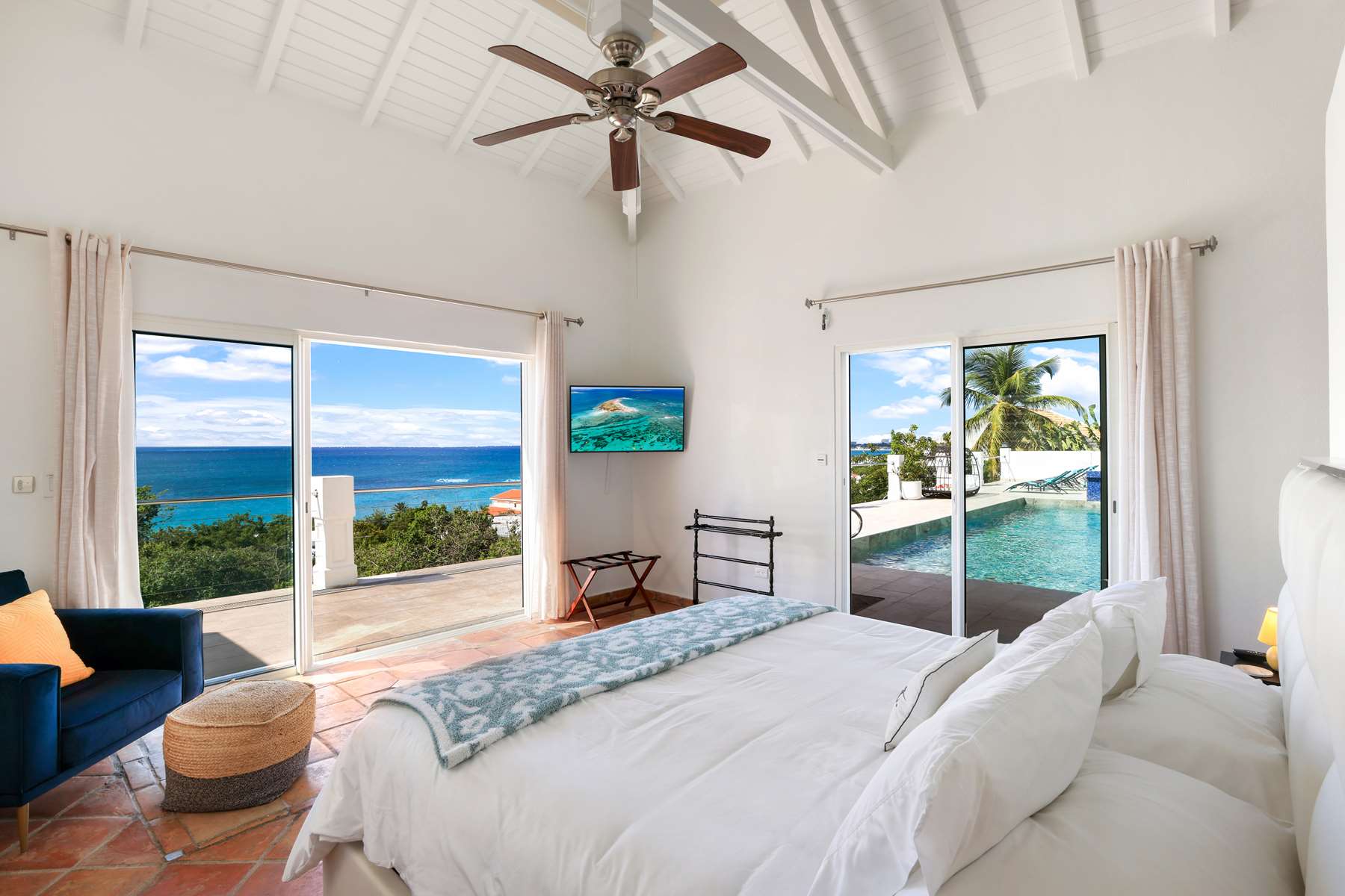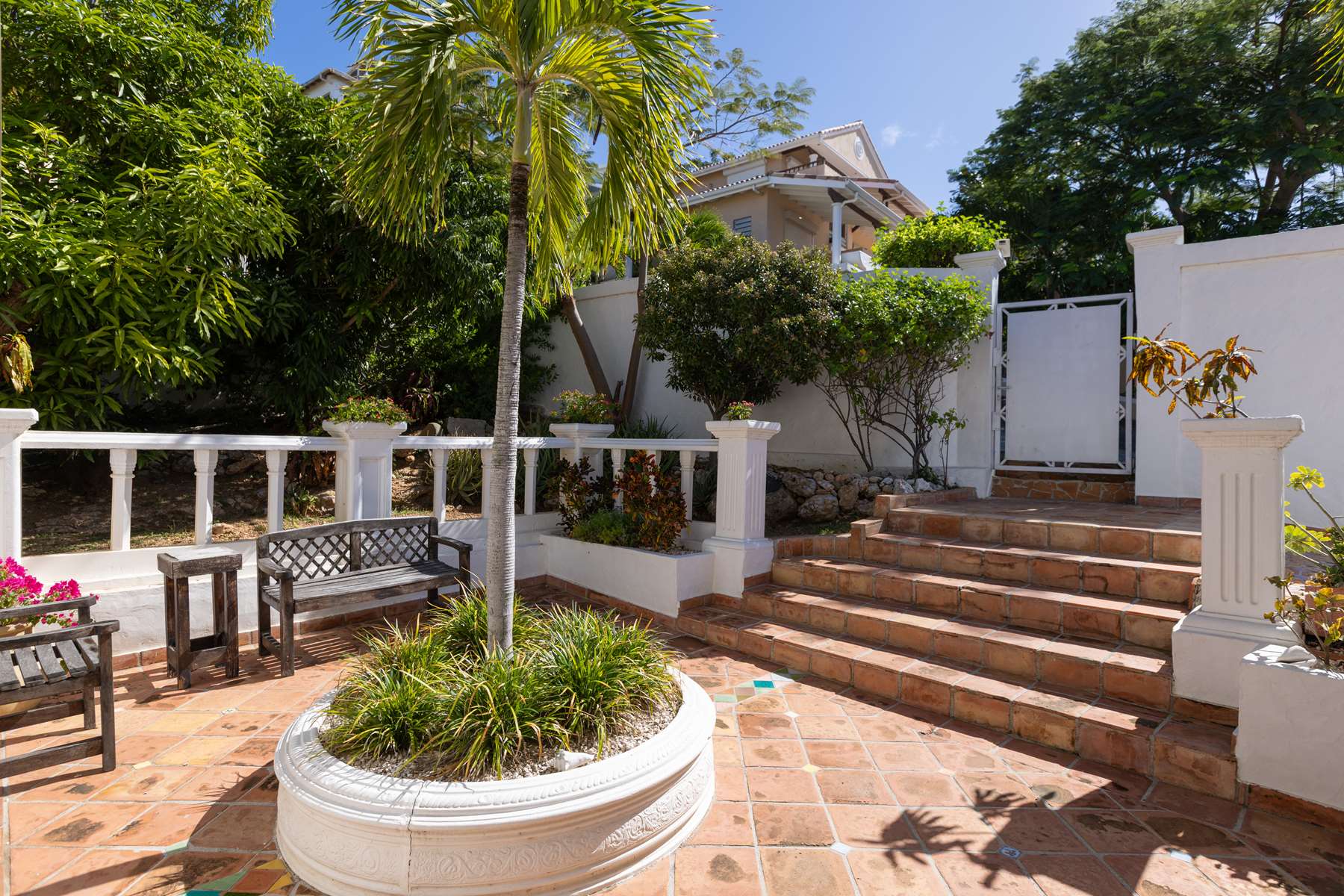 This magnificent Spanish-style family villa boasts 5 bedrooms each with their own ensuite bathrooms, a guest bathroom, and spectacular unobstructed ocean views on a southwest facing property in the most popular neighborhood in St Maarten, Pelican Key. The villa sits on a large double lot with a landscaped garden lot that the pool deck overlooks.