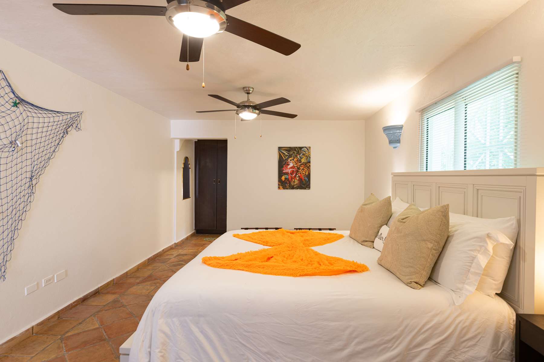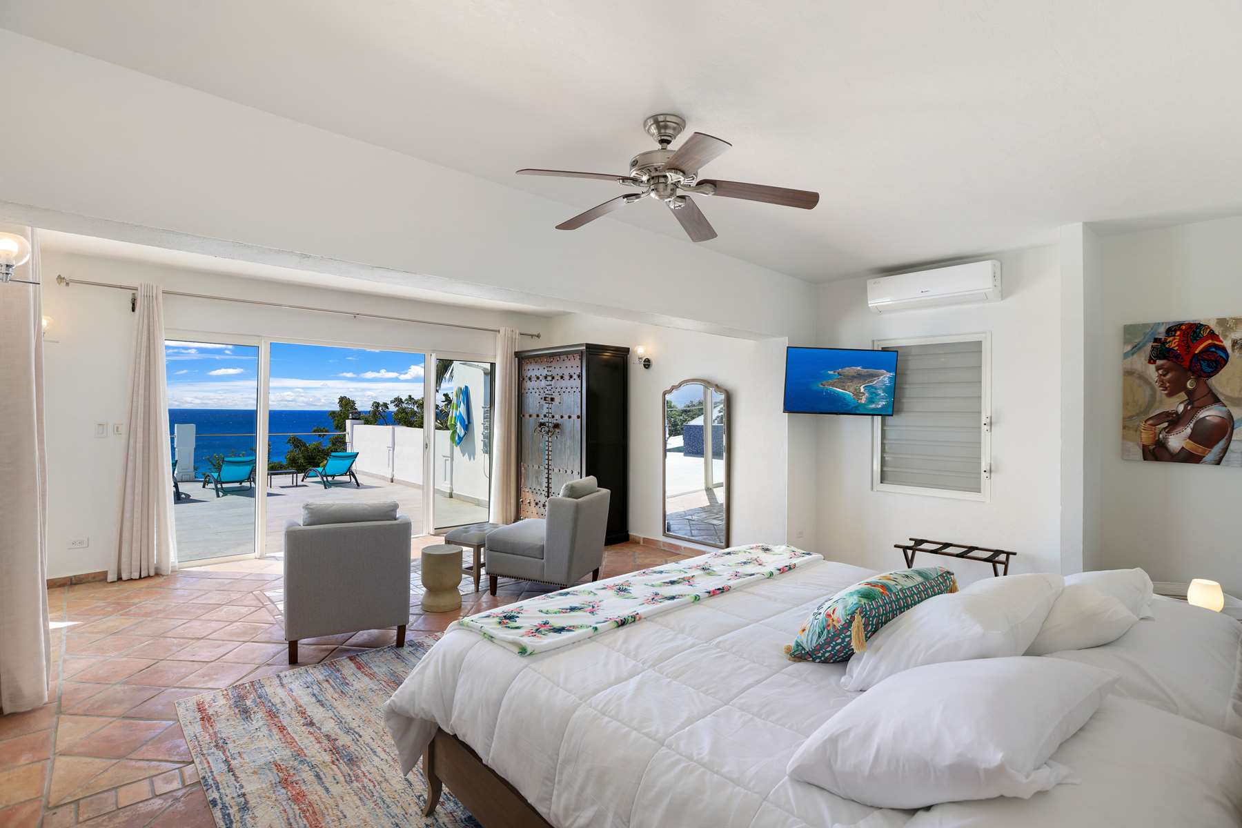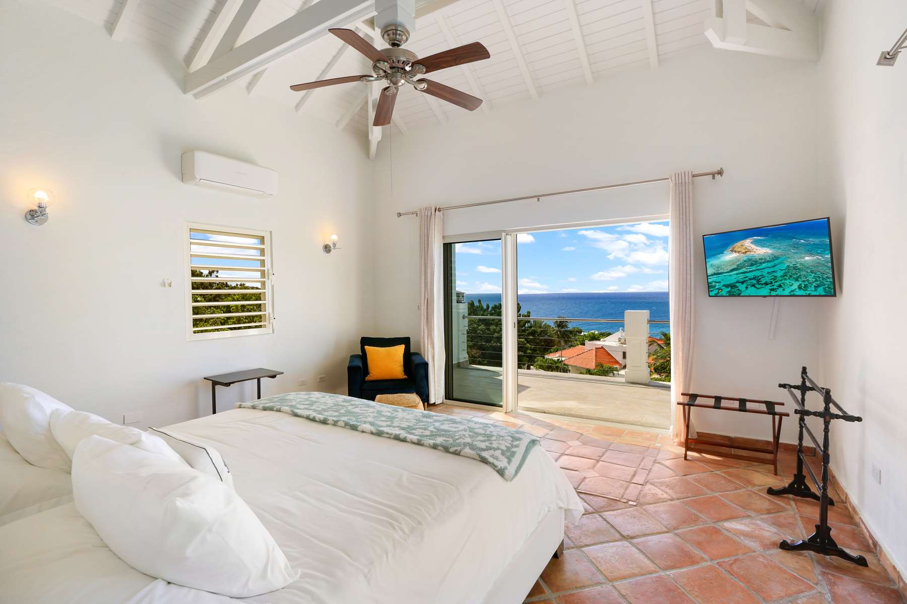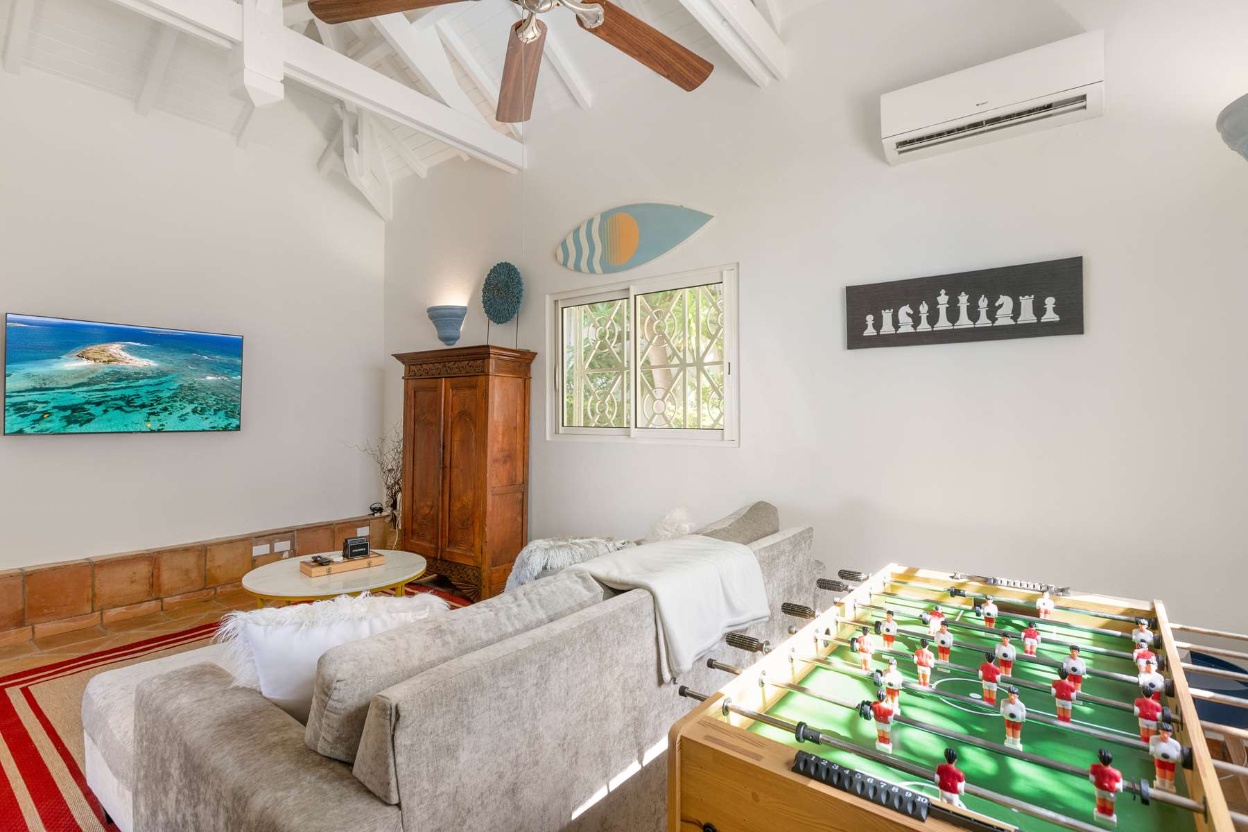 There are 3 bedrooms on the ground floor plus game room with foosball table and board games, 3 bedrooms have ensuite bathrooms and built-in closets, and 2 bedrooms directly connect to the pool deck. Upstairs you will find a large room with 2 queen beds with a spacious ensuite bathroom and private balcony with the same stunning views.